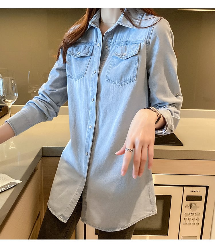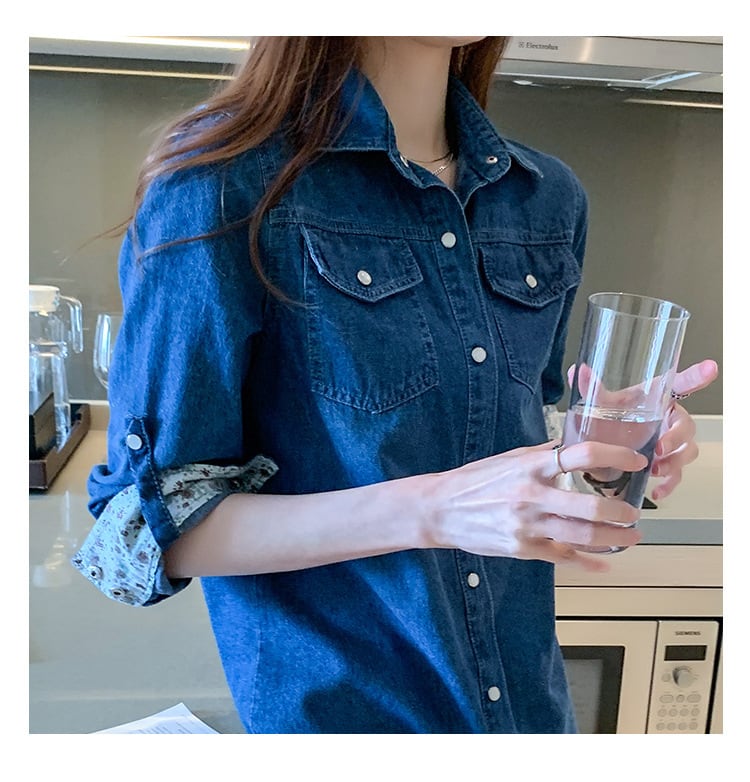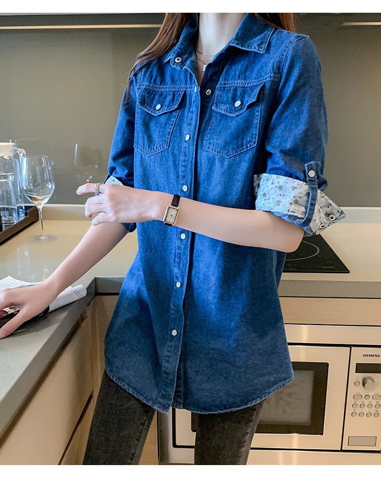 デニムシャツ レディース 長袖 シャツ デニム 襟付き 前開き ロング丈 花柄 ロールアップ きれいめ カジュアル 普段使い 可愛い デート お出かけ 2XL 3XL 大きい ブルー 大人 コーデ コーディネート 韓国 ファッション オルチャン お取り寄せ 送料無料 hll-1453