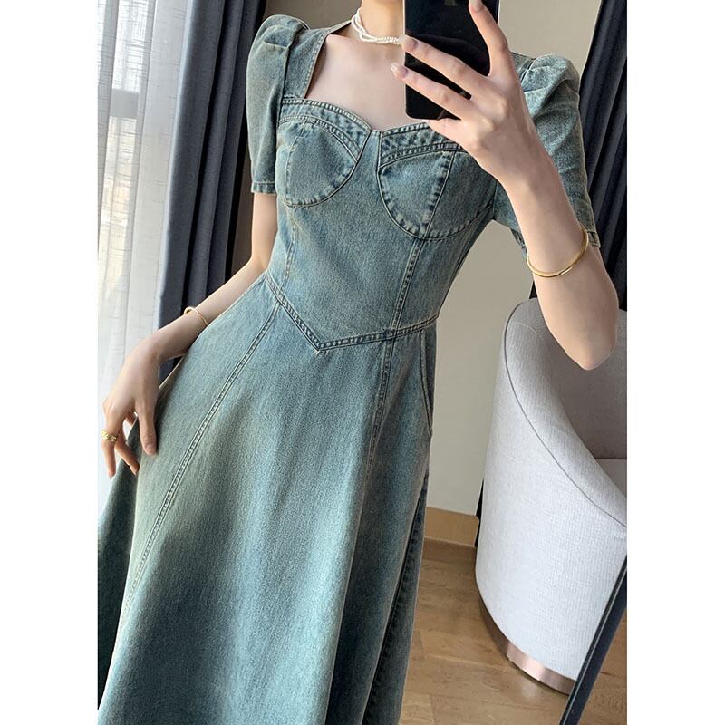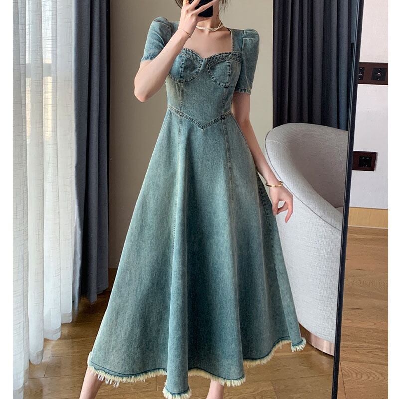 デニムワンピース レディース 半袖 デニム ロング ワンピース キレカジ スクエアネック タイト フレア 無地 カッコいい デート お出かけ 女子会 10代 20代 体形カバー XL 大人 コーデ コーディネート 韓国 ファッション オルチャン お取り寄せ 送料無料 hll-1464