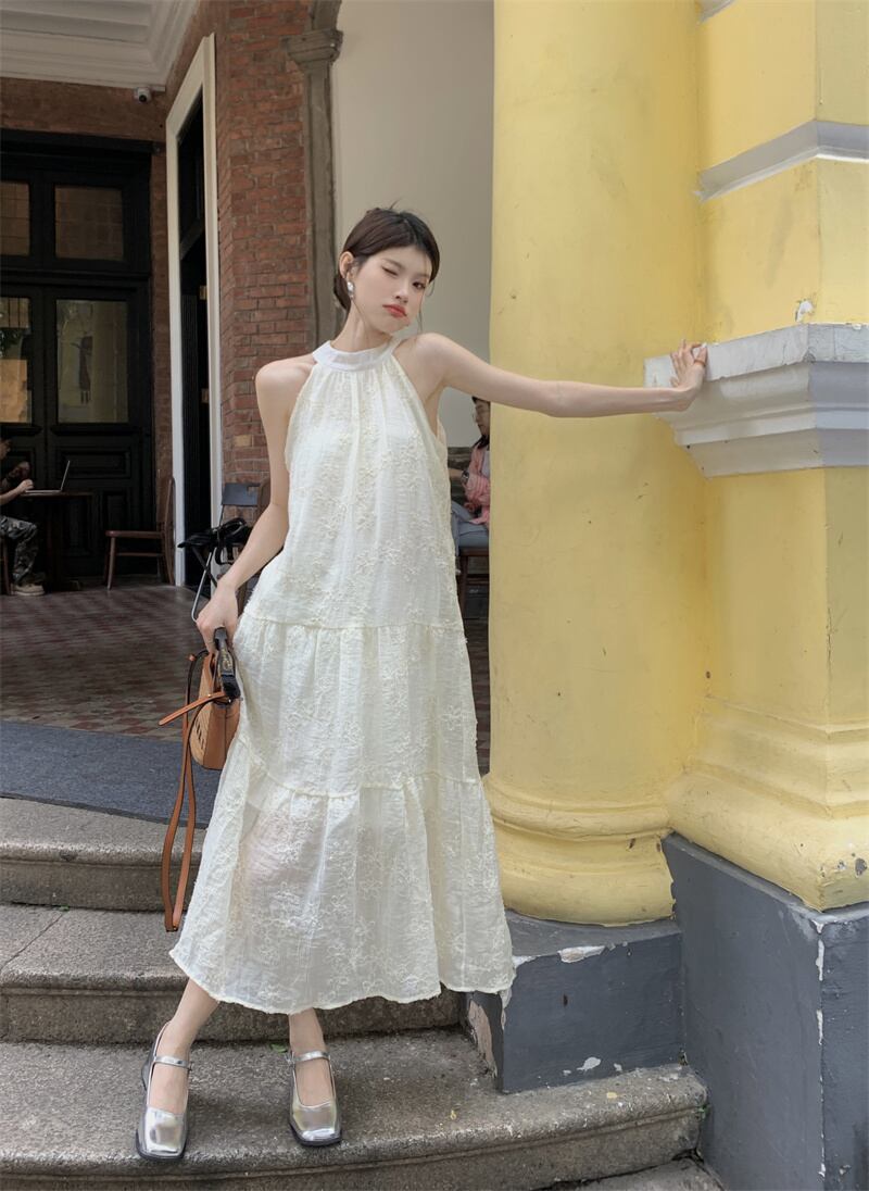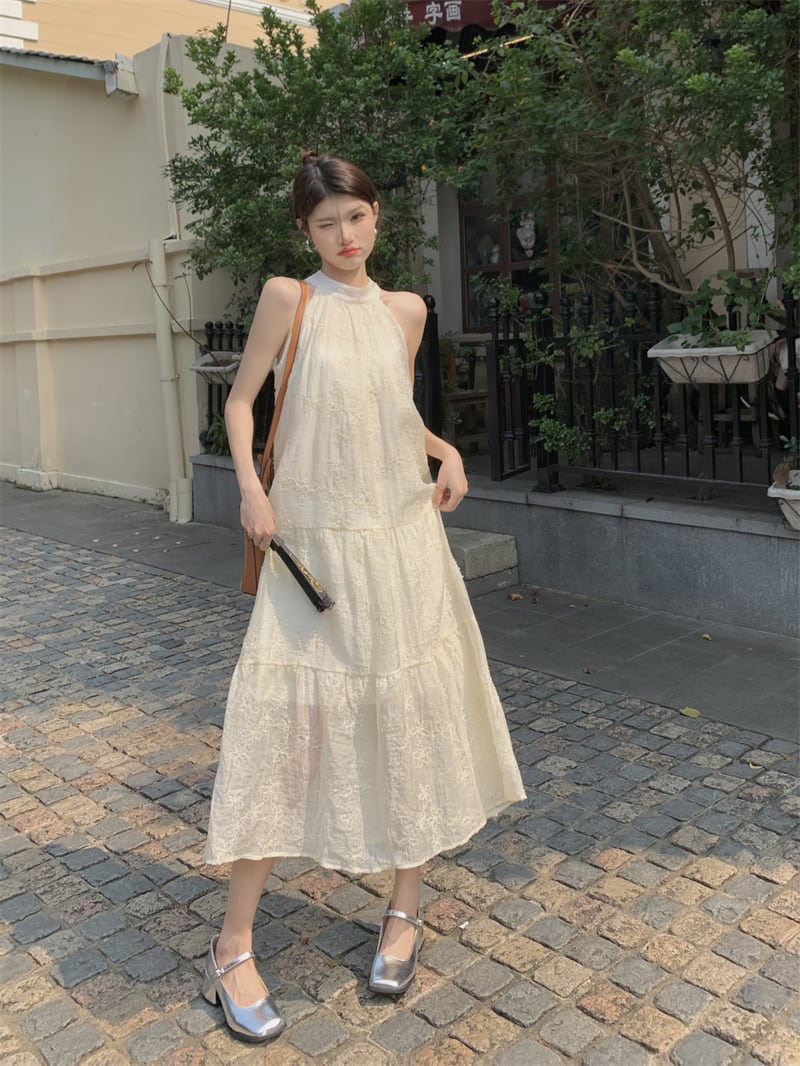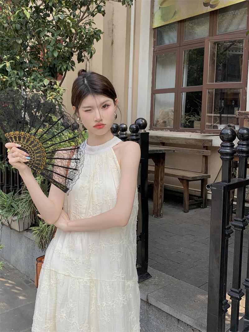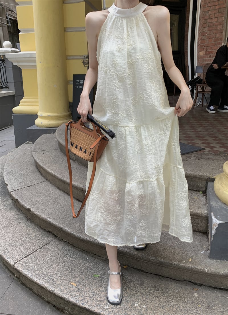 ワンピース レディース ロング ホルターネック フレア Aライン ティアード 透け感 清楚 可愛い 刺繍 デート お出かけ 女子会 リゾート 旅行 白 L 春 夏 10代 20代 大人 コーデ コーディネート 韓国 ファッション オルチャン お取り寄せ 送料無料 hll-1517