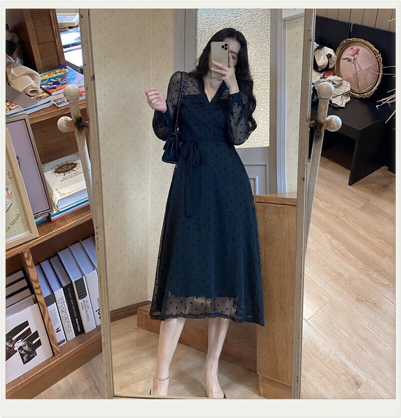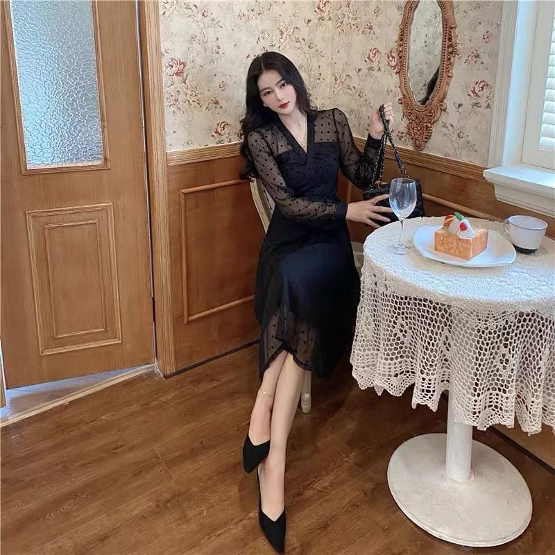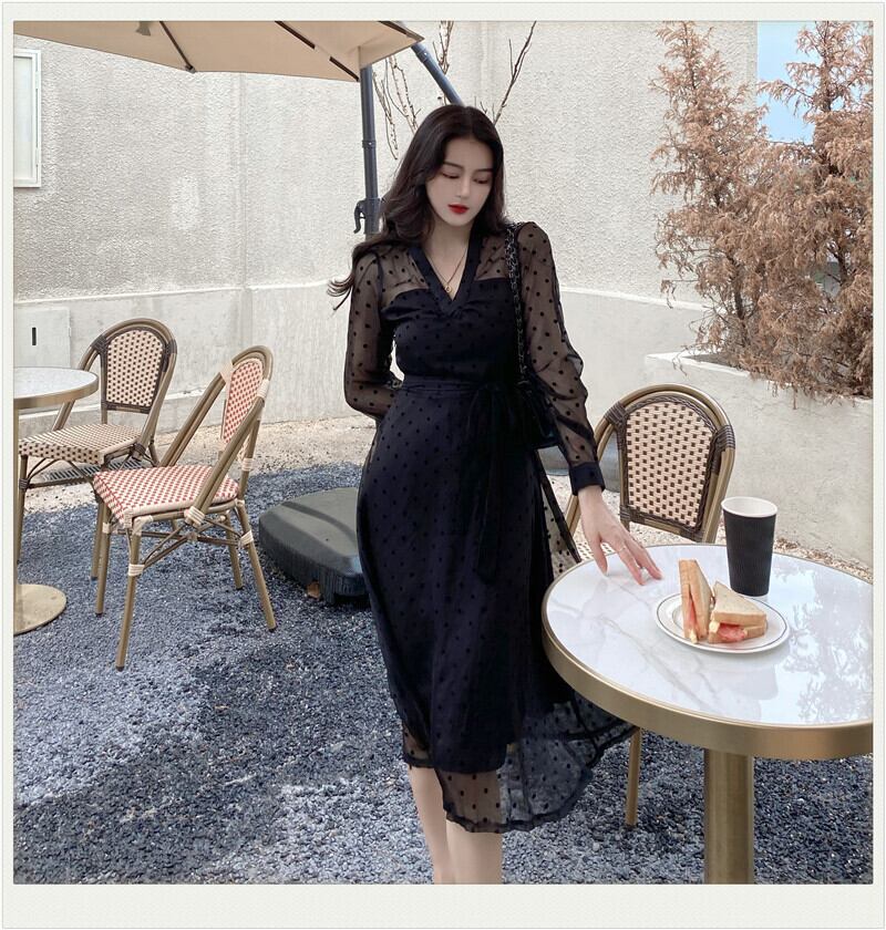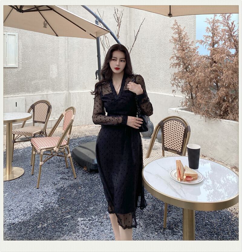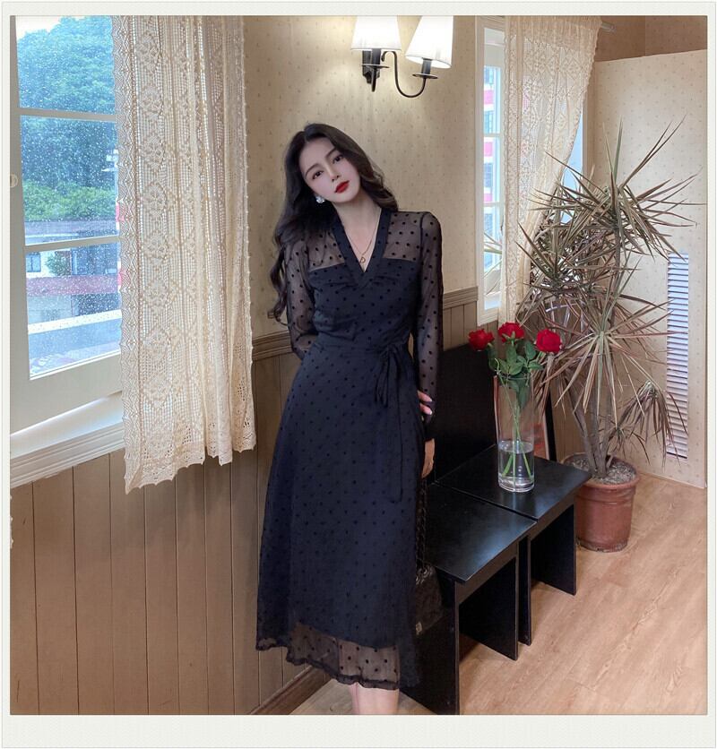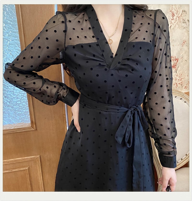 シアーワンピース レディース ドレス シアー ロング 長袖 Vネック 切り替えデザイン ひざ下 ドット 水玉 ウエストマーク リボン 透け感 きれいめ 結婚式 二次会 パーティー オフィス ビジネス 通勤 こなれ感 普段使い 着回し 日常 デイリー デート お出かけ お洒落 おしゃれ オシャレ ハイセンス トレンドアイテム 20代 30代 40代 黒 2XL 3XL 4XL 大人 コーデ コーディネート 韓国 ファッション オルチャン お取り寄せ 送料無料 hll-1694